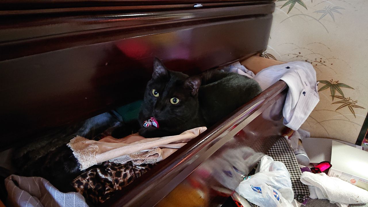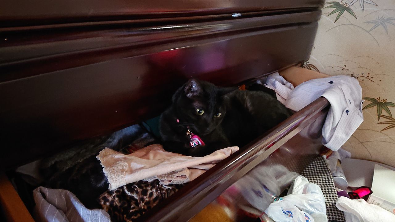 2019年06月21日 昨日ちょっと出掛けたら…… 旦那がタンスを開けっ放しで出掛けていたらしく、帰宅すると自分が入りやすいようにカスタマイズして、母鳥が抱卵するかの如く旦那の服を一心不乱に暖めるリコ様がいました。 その後数時間経っても彼女はそこを離れず…… およそ2時間後ようやく飽きてタンスから出て伸びをした後、再び向きを変えてタンスに戻って行きました。 ……本当に卵でも孵す気か!?